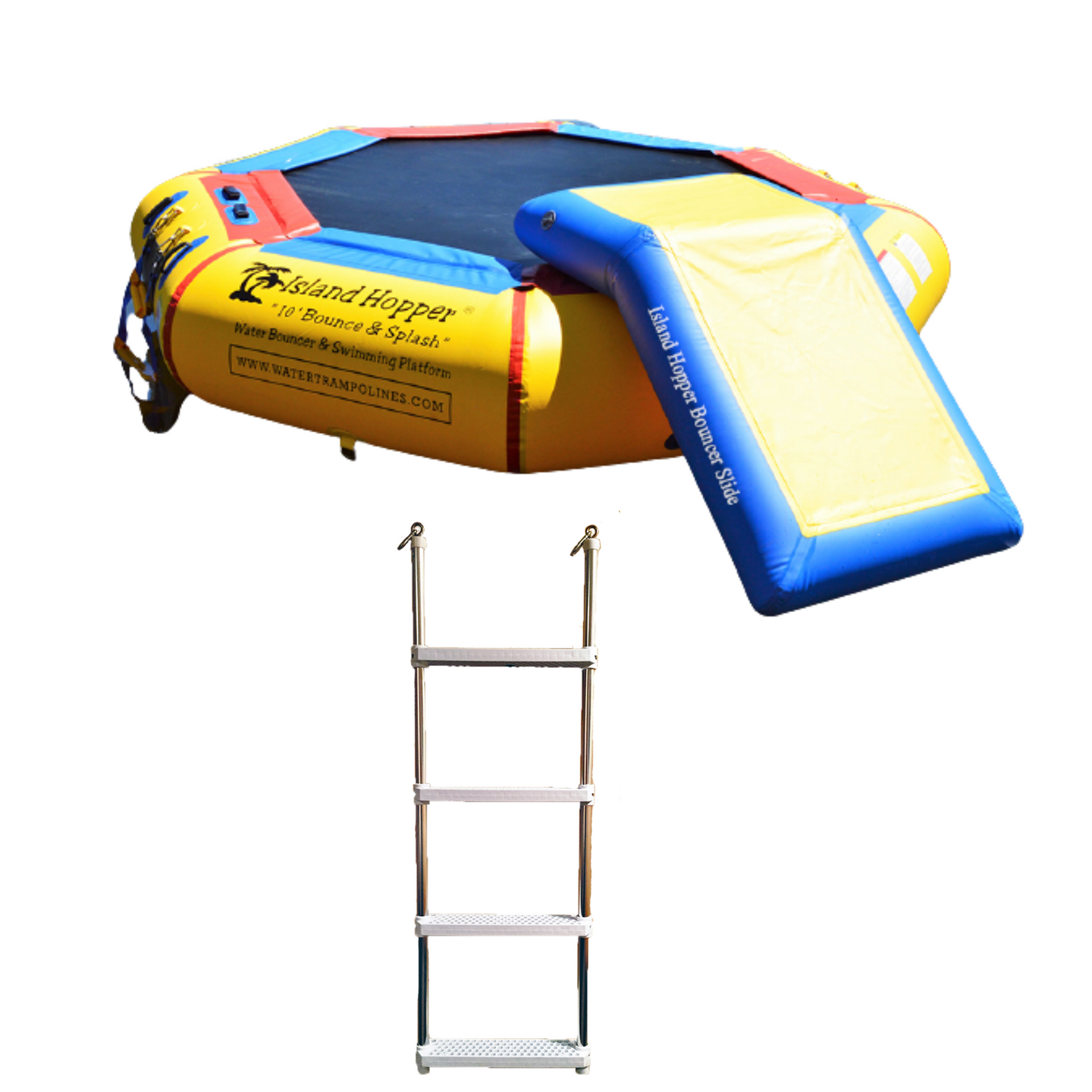This product has the same high quality reinforced materials that go into all Island Hopper® water trampolines and bouncers. This manageable 10′ size is perfect for kids to bounce on and for adults who are just into lounging. The spring-less, interlaced nylon webbing “bouncer” design uses tube flex features to give the user a short enjoyable “bouncer” lift. The 4 steps “easy access” ladder makes this a perfect product to turn a pond into a swim area or to throw on the boat and inflate at your favorite anchoring spot.